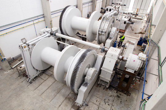 The winch has two waterfall drums each with a capacity of 2,500m of 86,9mm wire. Giving 350 tons per 10 metres/minute on the first layer with the same pull, speed increases to 50 metres/minute when offload is against the dynamic brake. The static brake capacity is 600 tons on each drum, divided between two differential band brakes. Each engine works with a gearbox joined together by a declutching transmission allowing drums to work simultaneously, reducing pull by half and giving greater versatility.